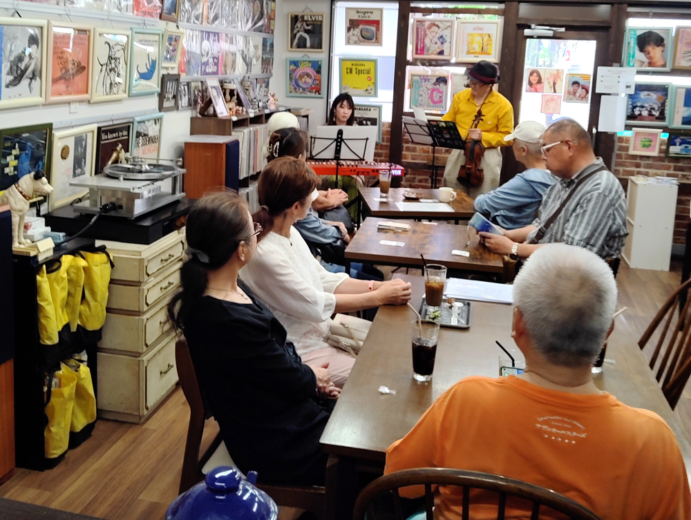 店内では不定期で軽音楽のライブを開催しております。アナログ音源と生演奏が響く特別な時間をおたのしみください。